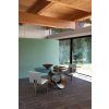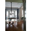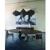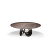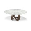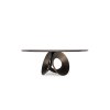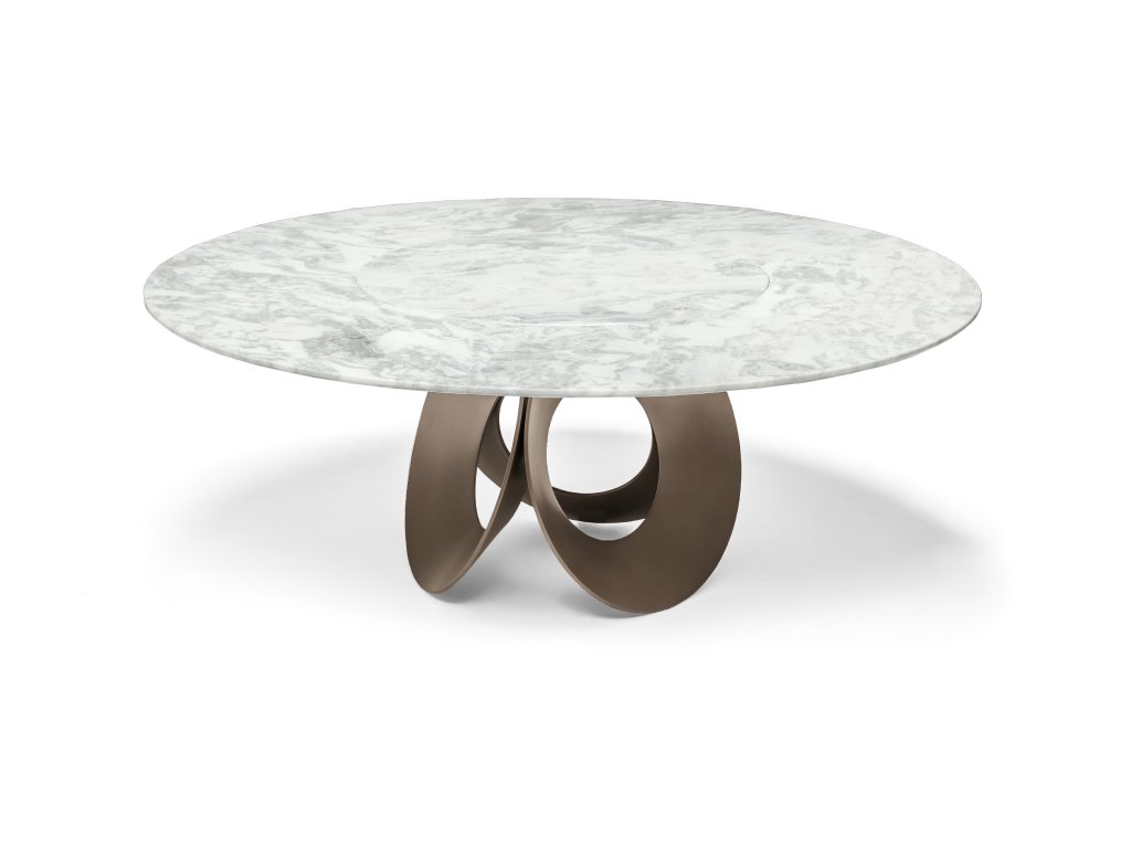 Jeho základna je mistrovským dílem výroby – tvoří ji tři kovové kruhy, které se setkávají v různých úhlech a dokazují, že elegance může být uměním a luxus může posouvat hranice. Jde o interiérové inženýrství, které je stejně ohromující, jako je promyšlené. Základna je dostupná v povrchových úpravách micaceous brown, brass, titanium a oxy grey, zatímco deska stolu může mít kulatý nebo oválný tvar a je k dispozici v provedení moka oak nebo sucupira, případně v mramoru Emperador či Niveo White, doplněná o otočný tác Lazy Susan, který je do stolu dokonale integrován.