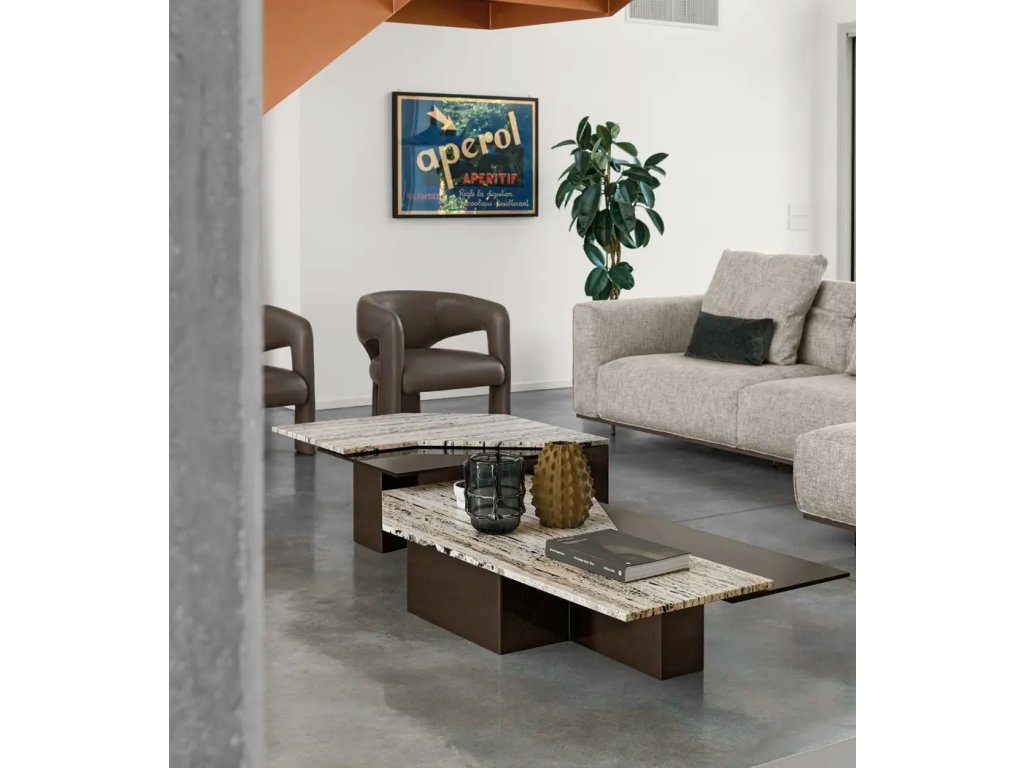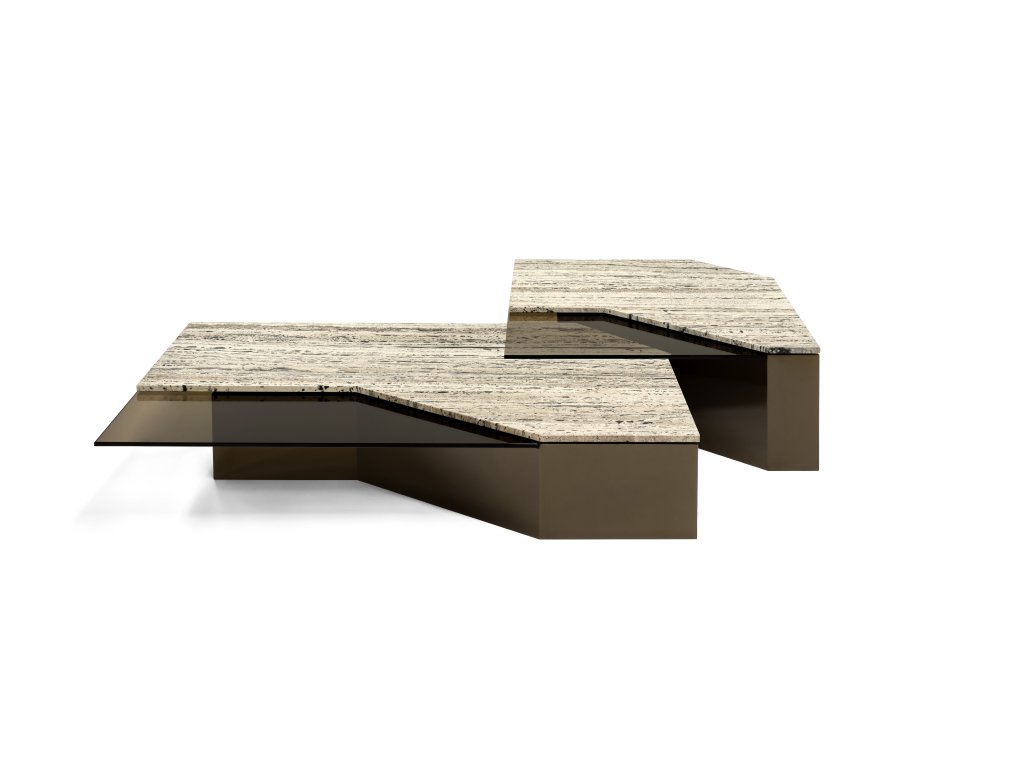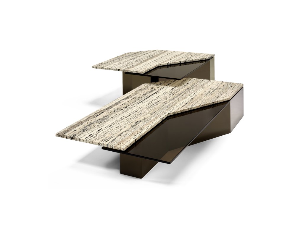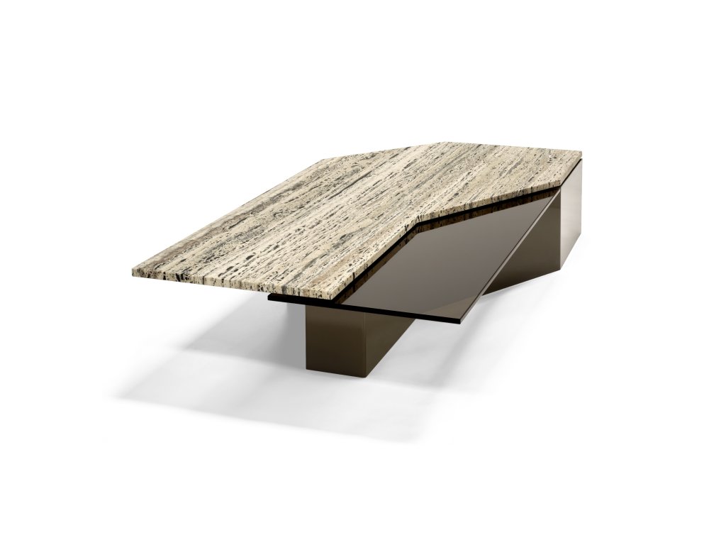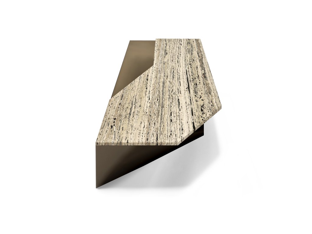 Tento nízký stolek je záhadou tvaru a materiálu – lesklý bronz či černý kov se zde setkává s jemným napětím mezi mramorem a sklem. Povrch, který se zdá být vznášející se mezi realitou a představivostí. Každá hrana, každý odlesk je šepotem něčeho víc – něčeho, co čeká na své objevení.