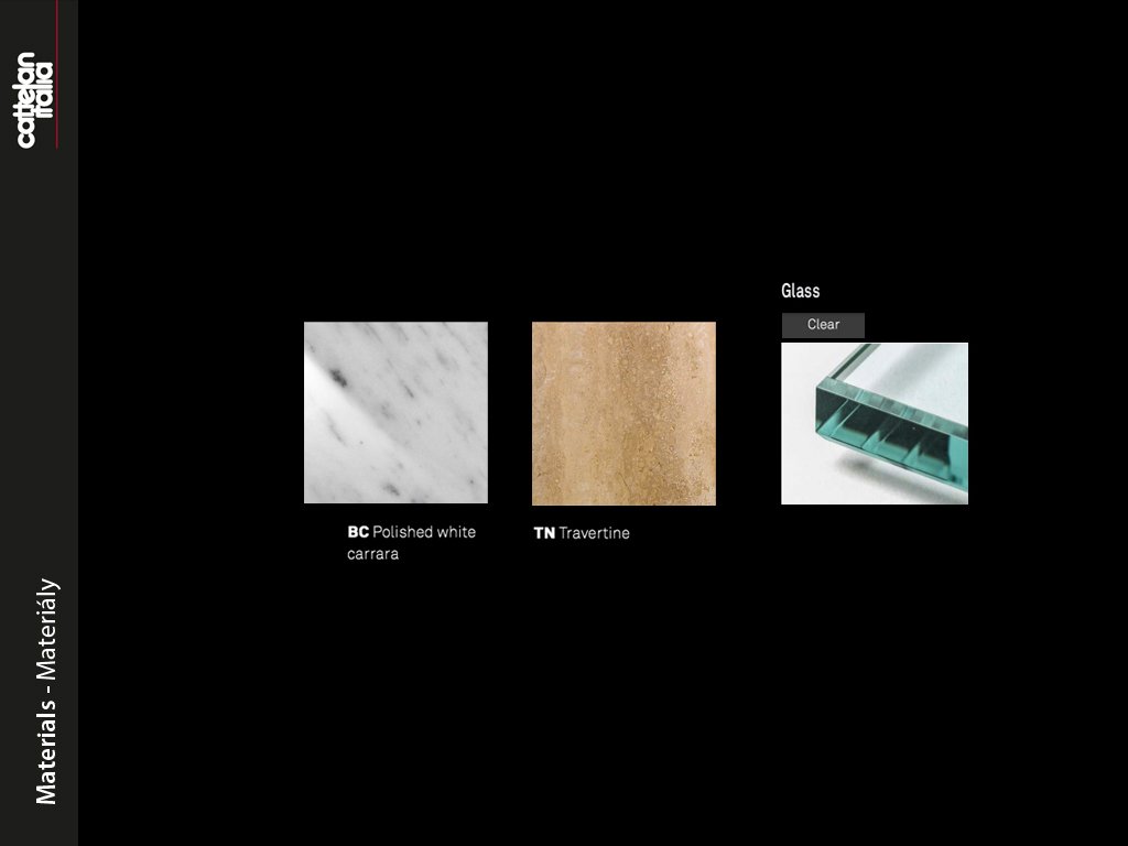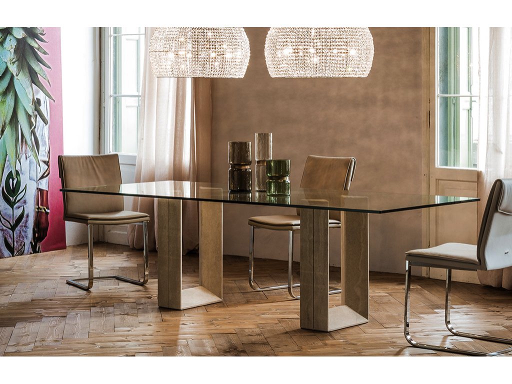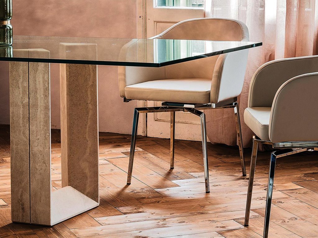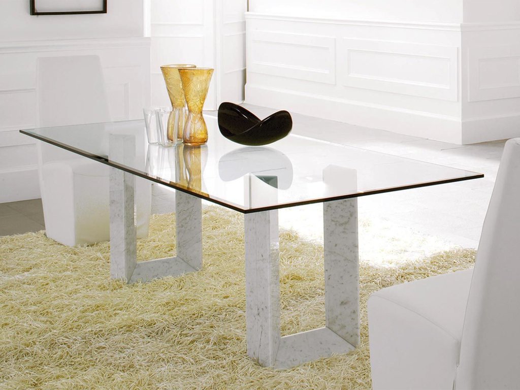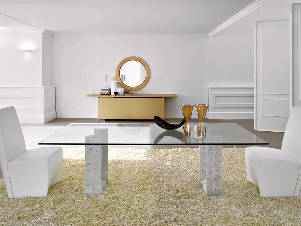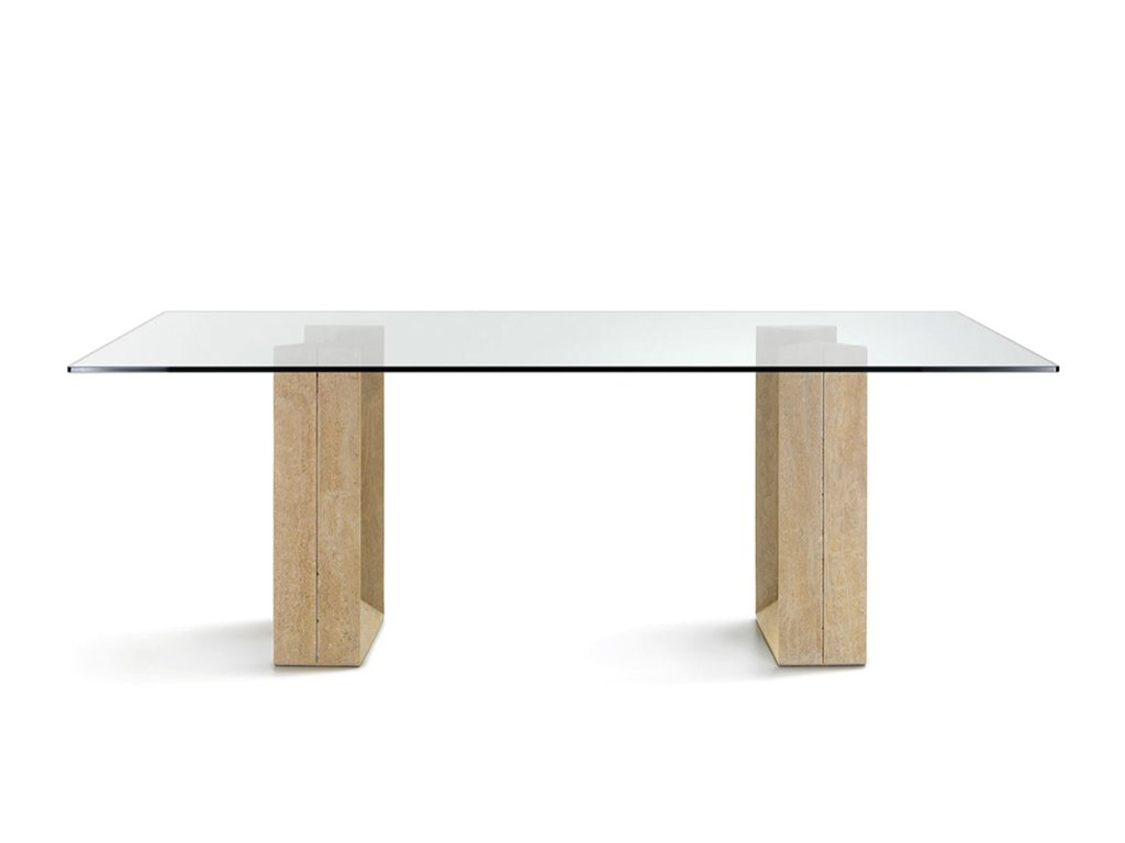 Stůl se základnou z travertinu nebo bílého mramoru Carrara a deskou z čirého skla o tloušťce 15 mm. Deska je položena na základně.