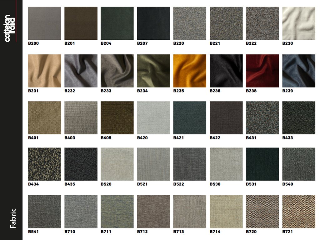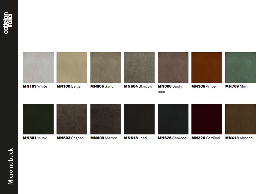 - Čalounění v látce, mikro nubuku, měkké kůži nebo syntetické kůži dle vzorníku. Potah není snímatelný.