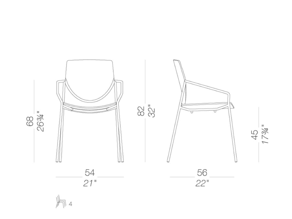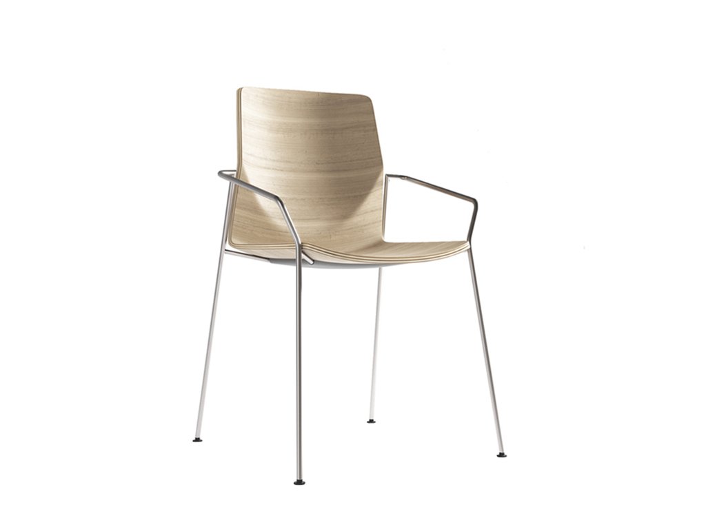 Stohovatelné křeslo s podnožím z pískované nerezové oceli Aisi 304. Zakřivený sedák z překližky je k dispozici v několika povrchových úpravách, s podsedákem v kůži na přání. Při stohování doporučujeme na podložku sedadla umístit ochranu. Klouže z nylonu s plstí.