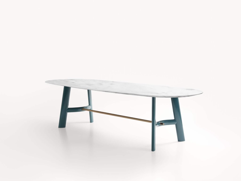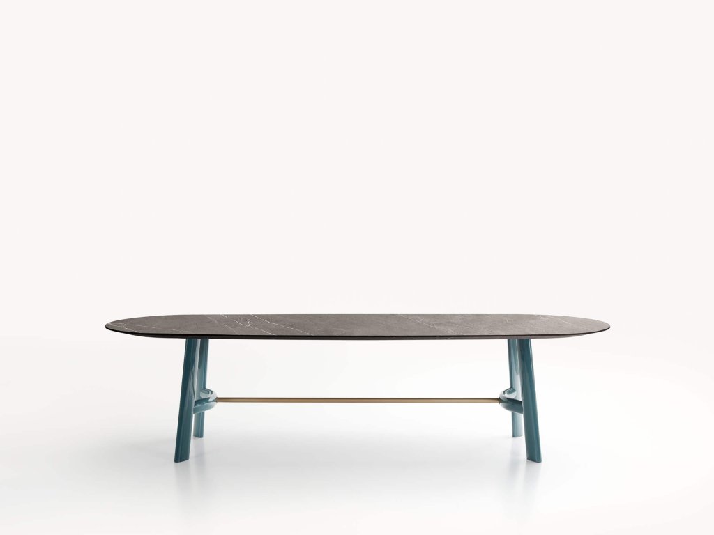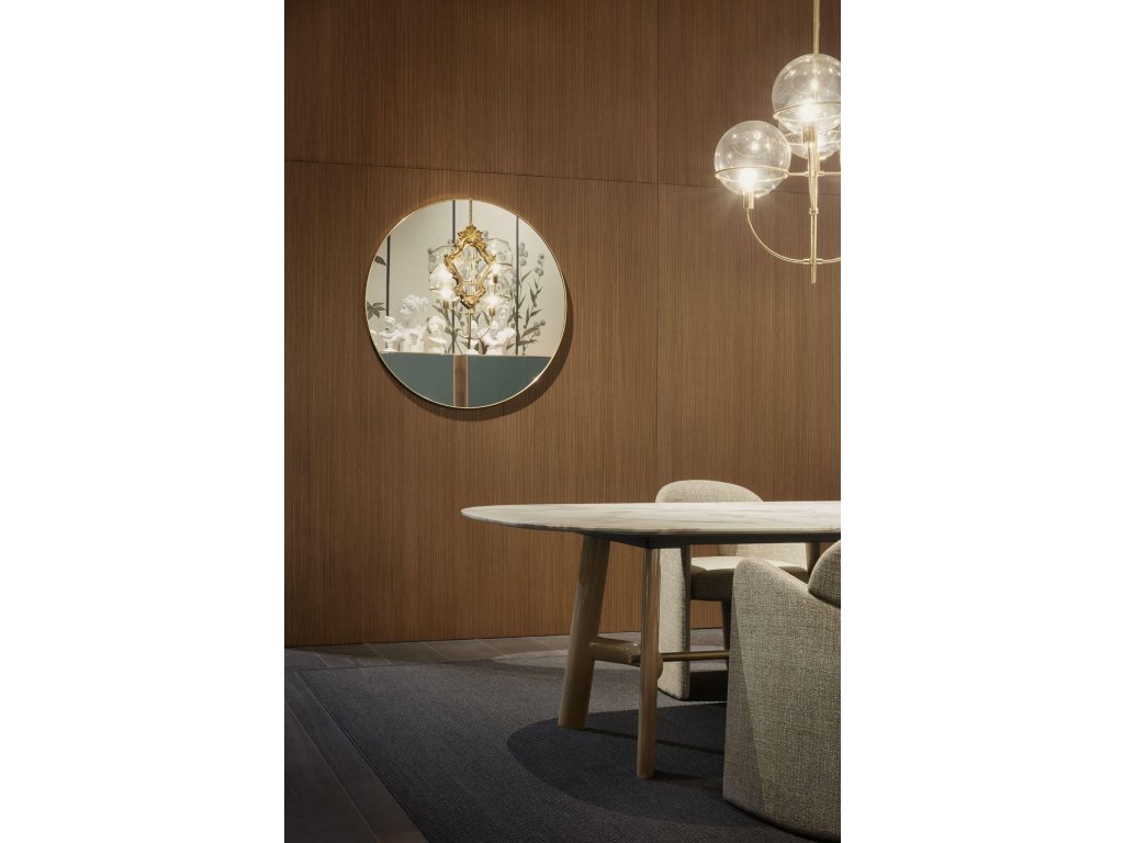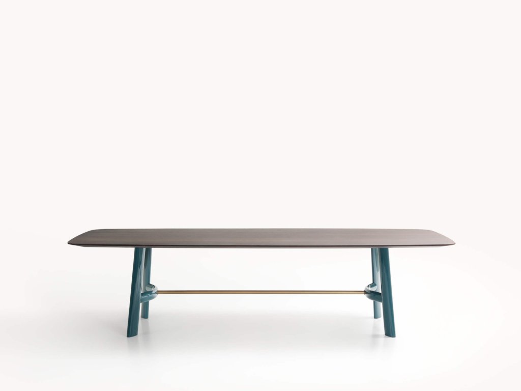 Konstrukce jídelního stolu August od designéra Roberta Lazzeroniho kombinuje sofistikovanost s vizuální lehkostí: subtilní deska z masivního dřeva nebo mramoru působí vzdušně, zatímco podnoží poskytuje stabilitu i výrazný vizuální charakter. Jednotlivé nohy jsou propojeny jemně prohnutou dřevěnou příčkou, uchycenou do kovových spojů s patinovaným bronzovým efektem.