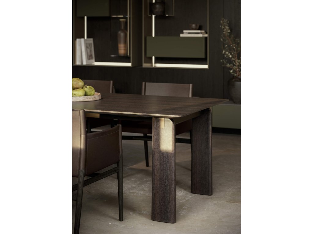 Masivní nohy z teplem upraveného dubu mají jemně zaoblený tvar, čímž vytvářejí charakteristický designový prvek. Kovová vsadka dodává moderní kontrast a zároveň podtrhuje estetickou vyváženost mezi přírodním materiálem a současným stylem.