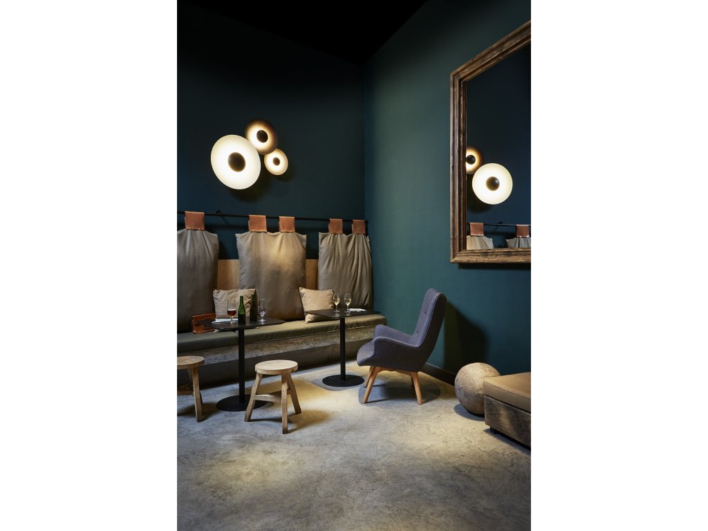 Nástěnná verze je k dispozici ve čtyřech velikostech, které lze kombinovat do dvou- nebo tříprvkových sestav napojených na jeden světelný zdroj. Její sofistikovaný, téměř sochařský design odhaluje skrytý zdroj světla a činí z ní nejvýraznější model celé kolekce. Kovové provedení přichází v nových barvách – fialové, šedé a pískové – které dodávají světlu jemné nuance a ladí s minimalistickou elegancí Ginger. Barvy lze navíc vzájemně kombinovat, což vytváří jedinečné vizuální efekty.