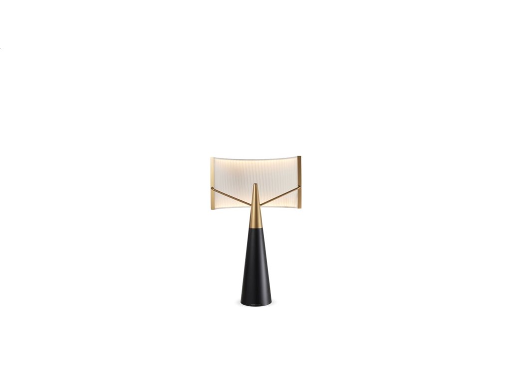 Světlo je jemně filtrováno skrze vrstvené panely, což vytváří elegantní 360stupňovou záři. Konstrukce sází na geometrickou čistotu a subtilní kovovou základnu, která nechává vyniknout samotnému stínidlu. Díky své výšce a vyváženým proporcím je ideální jako dekorativní prvek na komodu, pracovní stůl nebo noční stolek v moderně laděném interiéru.