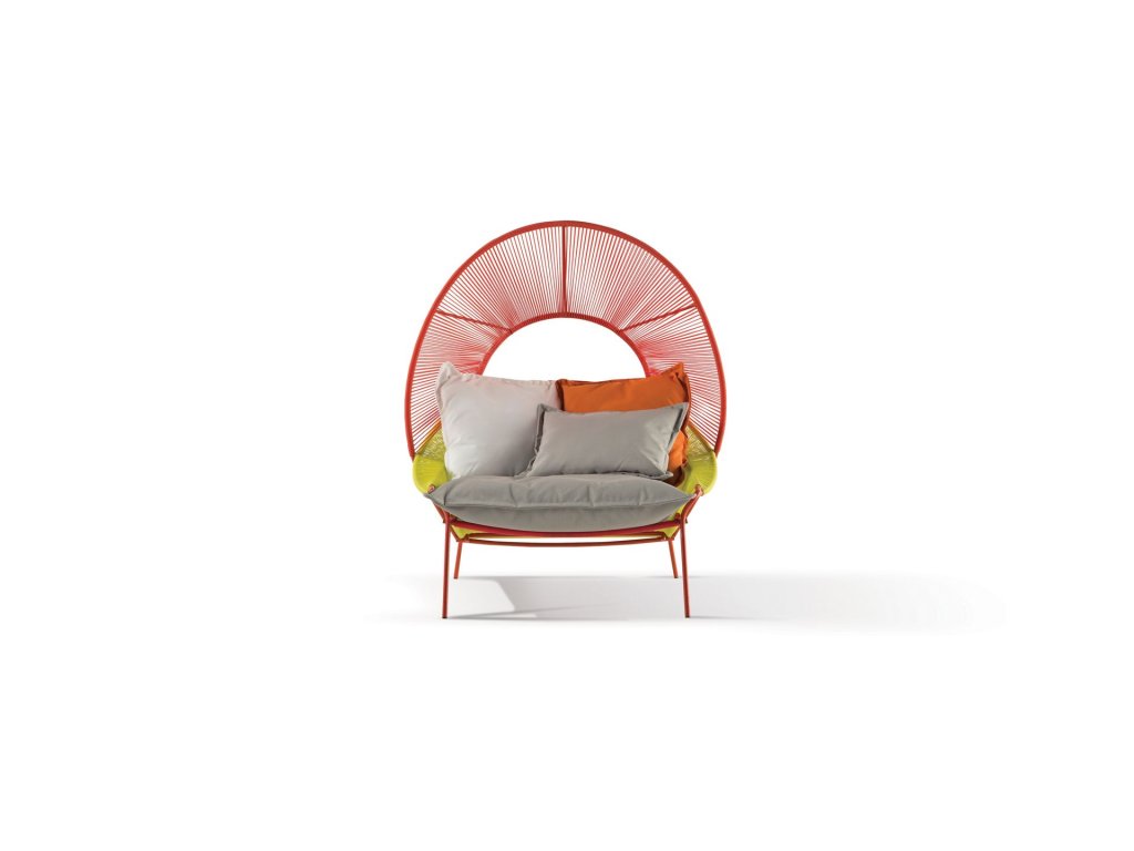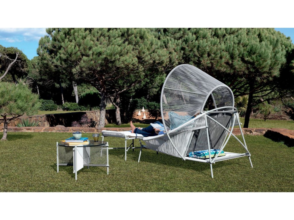 Křeslo vyniká svou subtilní, ale pevnou trubkovou konstrukcí z nerezové oceli, která je ručně oplétána polyethylenovou pryskyřicí. Horní část křesla tvoří nastavitelná stříška, která poskytuje ochranu před sluncem a vytváří pocit soukromí. Sedací a opěrné polštáře jsou navrženy speciálně pro venkovní použití s vysokou odolností proti povětrnostním vlivům.