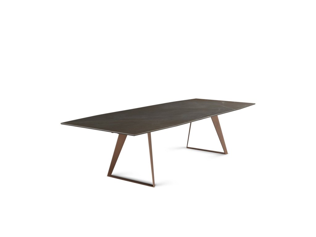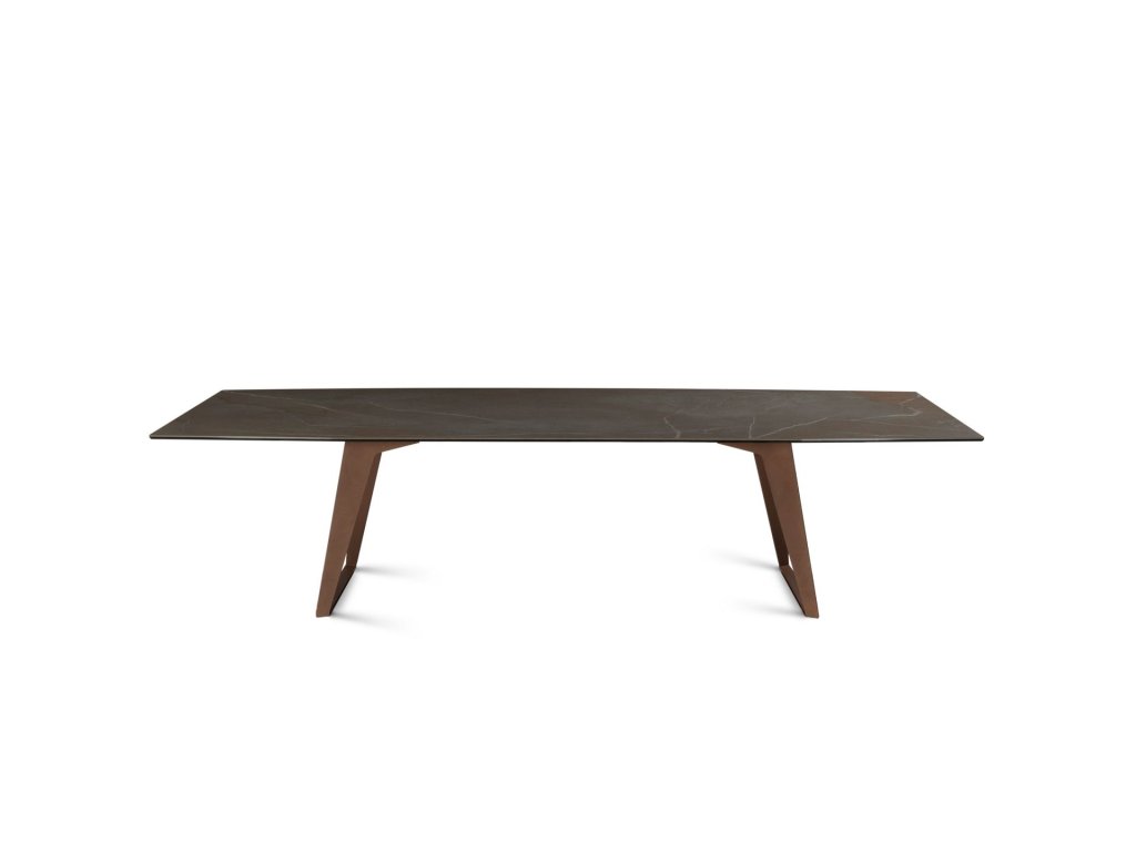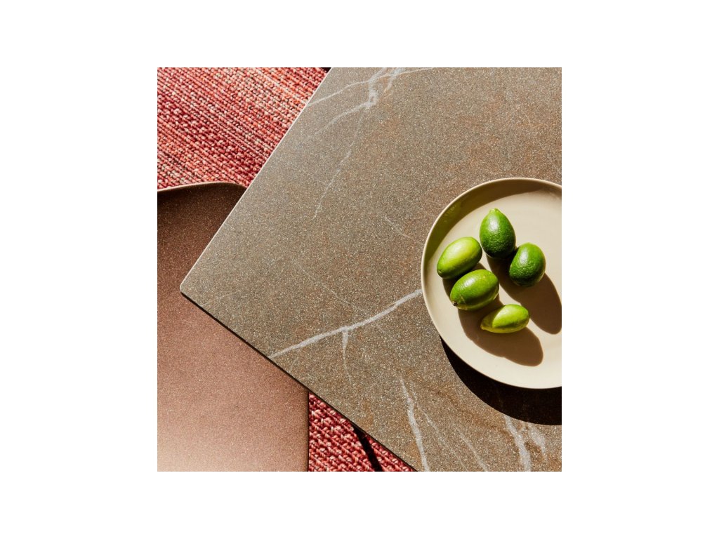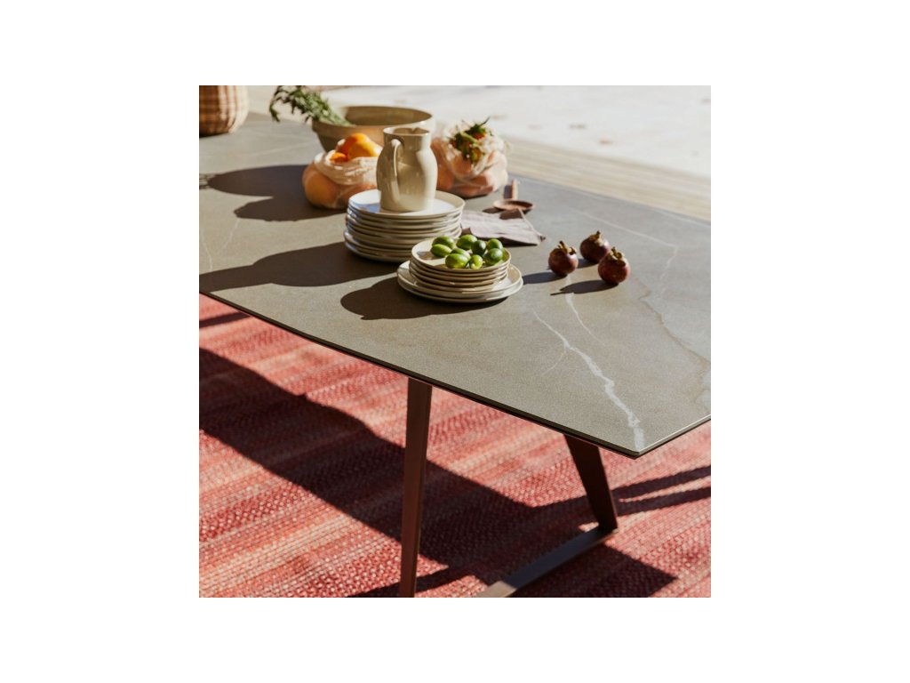Charakteristickým prvkem stolu je podnoží tvořené dvěma ocelovými deskami (nožkami) ve tvaru lichoběžníku, které jsou šikmo nakloněny směrem k sobě. Celá konstrukce je upravena speciálním venkovním lakem pro maximální odolnost. Deska stolu s osmiúhelníkovým (octagon) tvarem a výrazným biseautovaným (zkoseným) profilem nabízí velkorysý prostor pro stolování a stává se dominantou každé terasy.