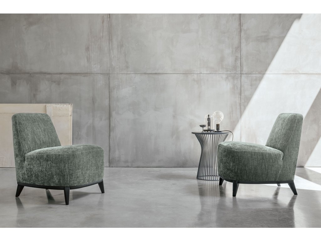 Malá křesla a dvoumístné pohovky, ať už jednotlivě, nebo dohromady, vítězí díky svým měkkým liniím a designu inspirovanému retrò, který povyšují šikmé dřevěné nohy. Díky své pevné konstrukci je ideální pro intenzivní chvíle odpočinku.